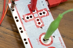 These types of electronic invention tools consist of a circuit board connected by a USB cable to a computer. Alligator clips, connected to a conductible material, enable current to flow in the circuit when the circuit is closed. An electrical signal is then sent to the computer, as either a keyboard stroke or mouse-click signal.