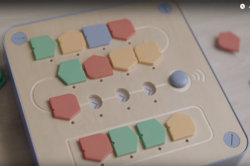 A play set available for purchase that introduces young learners, from 3 years old and up, to programming basics as they create steps using blocks that instruct a wooden robot.