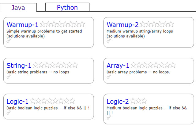 CodingBat is a free site of live coding problems for students to build their skills in Java and Python. CodingBat emphasises building and practicing small code problems as a means of developing these skills. Students can select particular areas of coding on which to concentrate. An interactive interface is provided and CodingBat has a basic authoring feature where anyone can write his or her own problems.