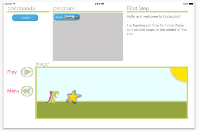 A coding game featuring a cute dinosaur that introduces young students to programming including writing basic commands with conditions and repeats. Students drag commands from a provided list, into the program window, press play, and watch as the dinosaur carries out the instructions. There are two modes: free-play mode and challenge mode.