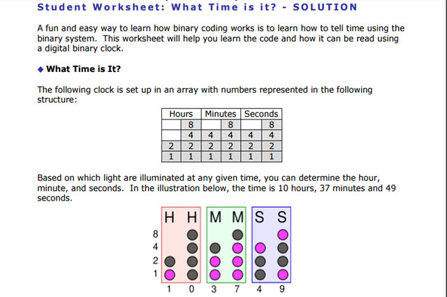 The document provides resources for teachers that focus on binary code and its applications. It provides activities that teach students how to download software, read a binary clock and build their own.