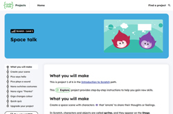 Create a space scene with characters that ‘emote’ to share their thoughts or feelings. Suitable for beginner coders.