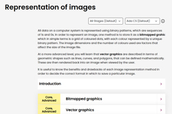 This comprehensive online guide, provides a background to ways images are represented in computer systems. This topic has information about bitmapped graphics and vector graphics.