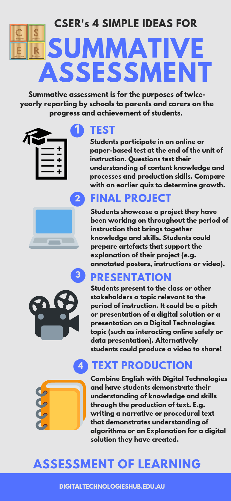 Watch this video to gain a sense of how the Achievement Standards for the Australian Curriculum Digital Technologies can be used for assessment. The video provides information to support you to create quality assessment tasks.