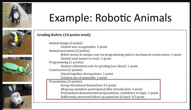 Dr Danahy shares his assessment components, which include: weekly challenges, a final project (design documents, development, self- and peer-grading and presentation) and a midterm exam. In the video, Danahy explains the assessment criteria in the context of designing a robotic animal. Advice from his assessment framework can be adapted for other robotics projects.
