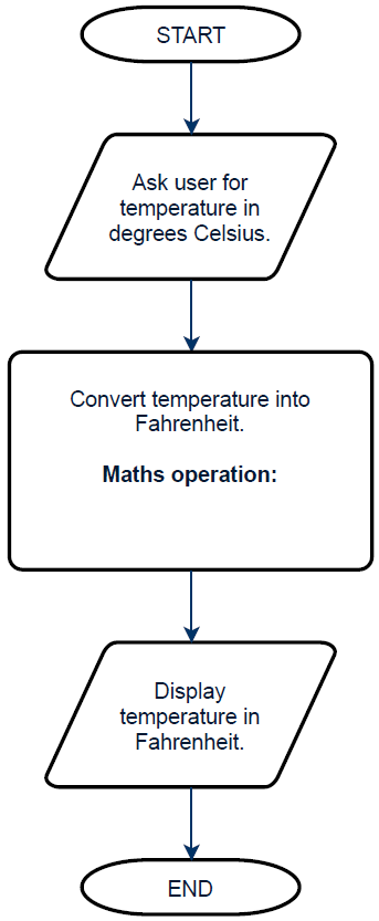 As a class, or in teams, design the program as a flowchart. Students must research and fill in the Maths operation. (Temp in Celsius) × 9 ÷ 5 + 32.