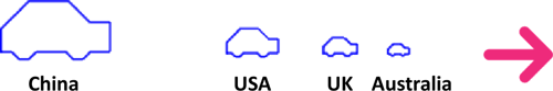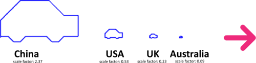 Finally, call your finished function with specific values so as to generate a size chart of 2018 new car sales data for four countries - China, USA, UK and Australia. eg. China's sales were about 23.7 million, so use a size factor of 2.37. USA size factor would be 0.53, and so on.