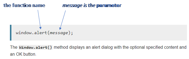 Here's the entry for JavaScript's alert function from the JavaScript documentation. You can see that it shows the function name, the parameters and describes what the function does.