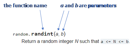 Here's the entry for Python's randint function from the Python documentation. You can see that it shows the function name, the parameters and describes what the function returns.