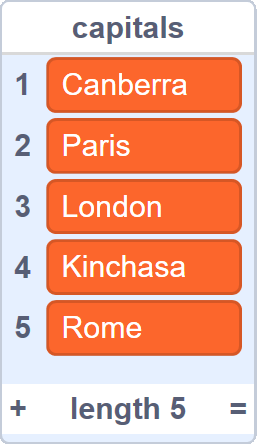 capitals = ['Canberra', 'Paris', 'London', 'Kinchasa', 'Rome'] print(capitals[4])