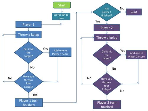 Use slides 7-8 to show sample flow charts for students to follow. Using slide 7 have a student role playing player 1 and following the steps. Ask what happens after Player 1 has finished their turn. Write the next steps of the flow chart. Slide 8 shows player 2 steps of having a turn.