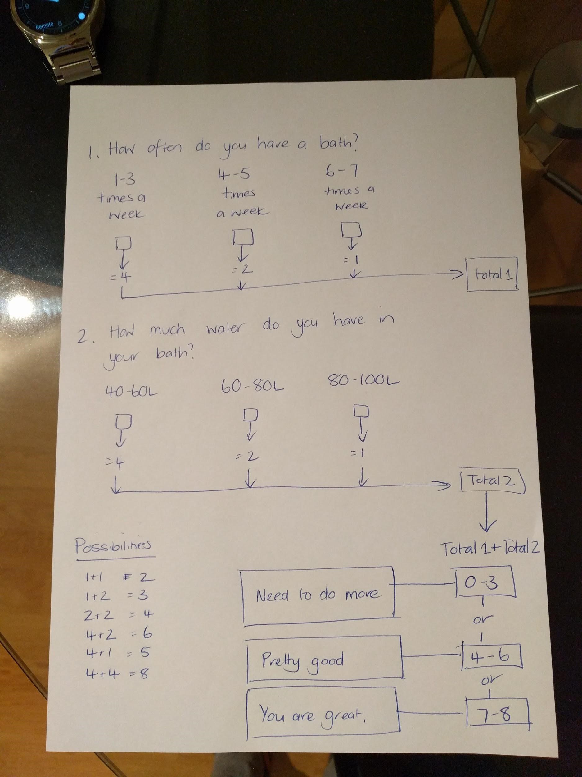 Creates a complex algorithm using visual diagrams to show the relationship between user decisions; includes codes to show input and output. Each answer is given a score that is developed on a scale in relation to other answers (for example, uses a scale from ‘No impact’ to ‘Disaster’ in order to give responses a numerical answer. Algorithm is shown using colour coding or shapes to distinguish between input and outputs. |