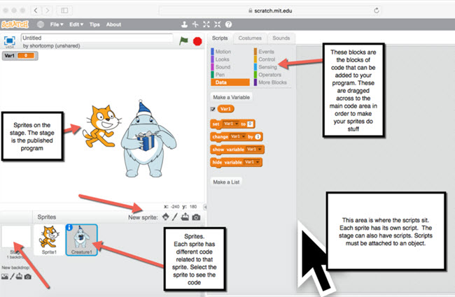 - Demonstrate to students that the scripts are attached to sprites, and that these actions occur on sprites. You can create a new sprite and demonstrate to students that the programming does not transfer with the sprite, that each individual sprite has its own programming.
