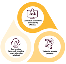 ACARA has developed Curriculum Connections focused on online safety. This resource guides educators to identify content in the Australian Curriculum that ensures online safety education is embedded, ongoing and integrated across learning areas. Refer to Online safety .